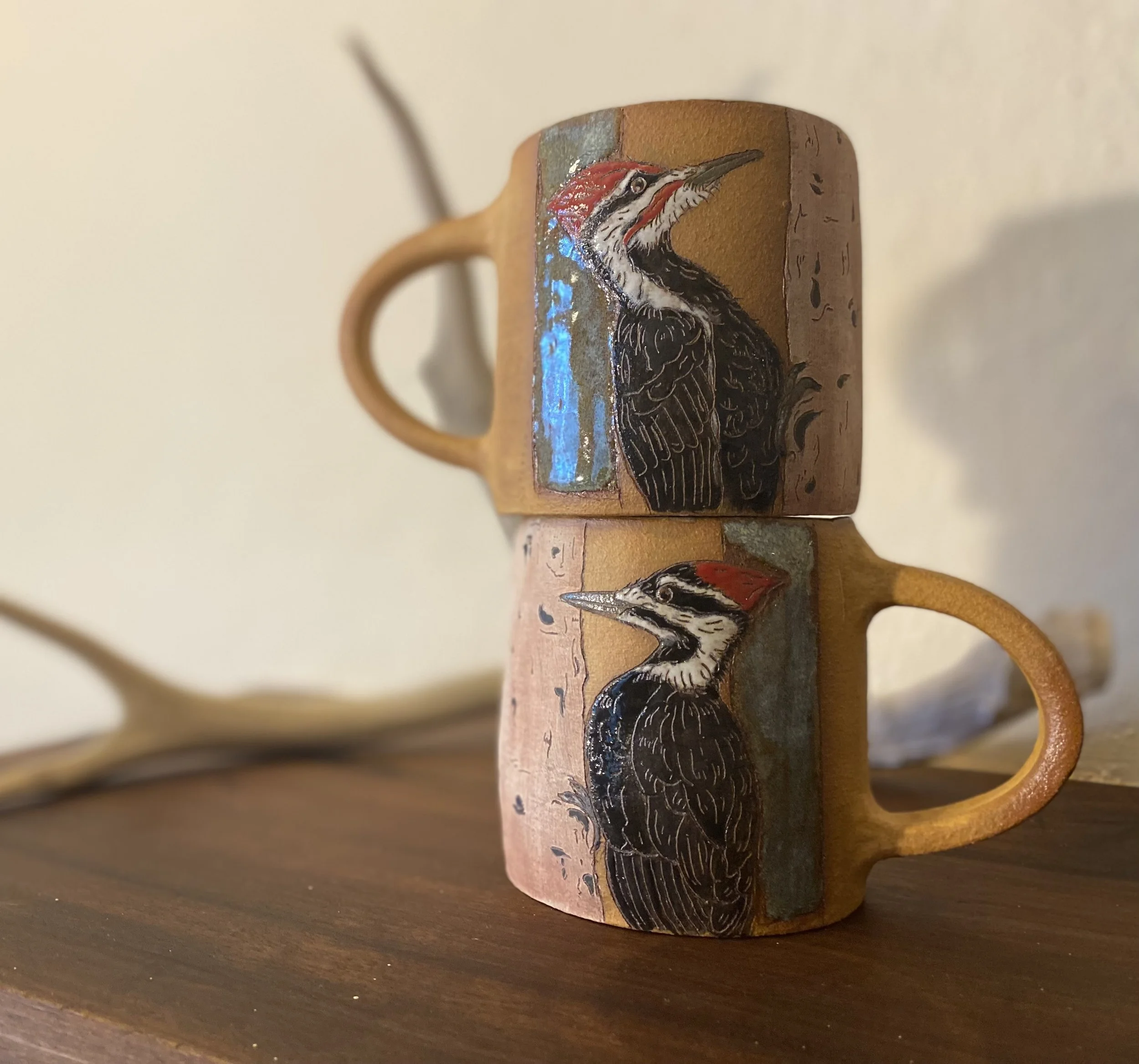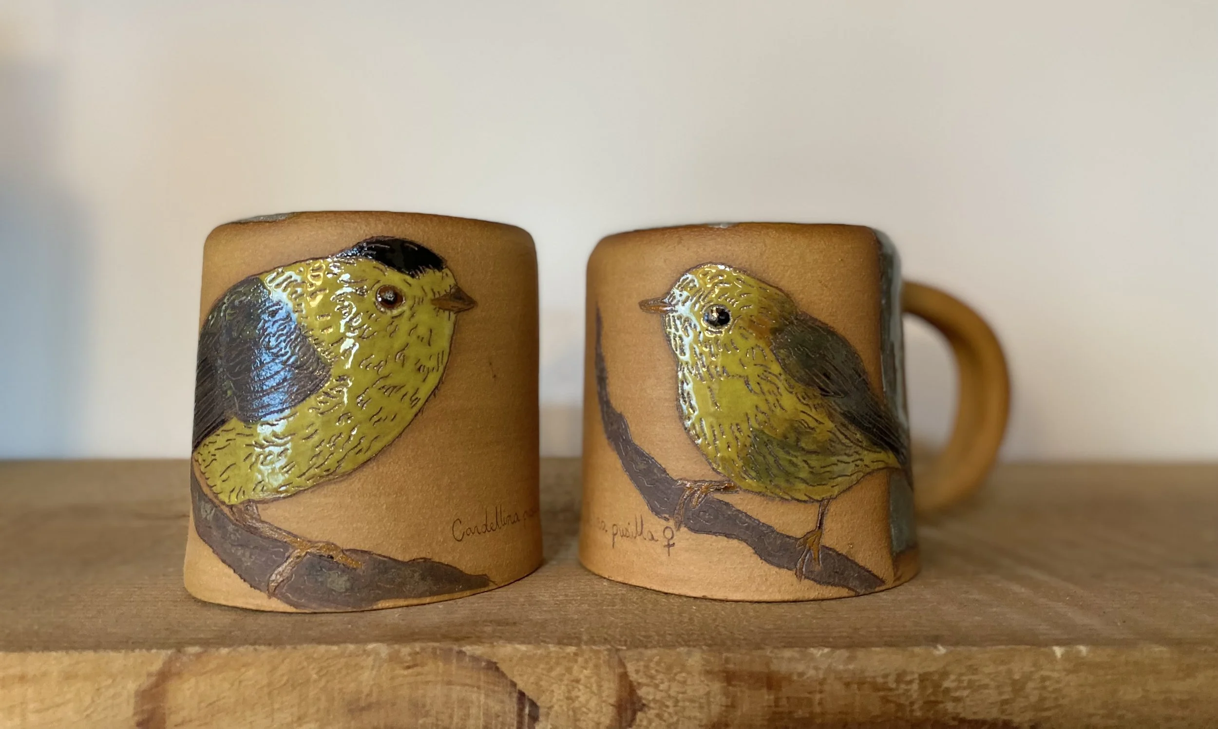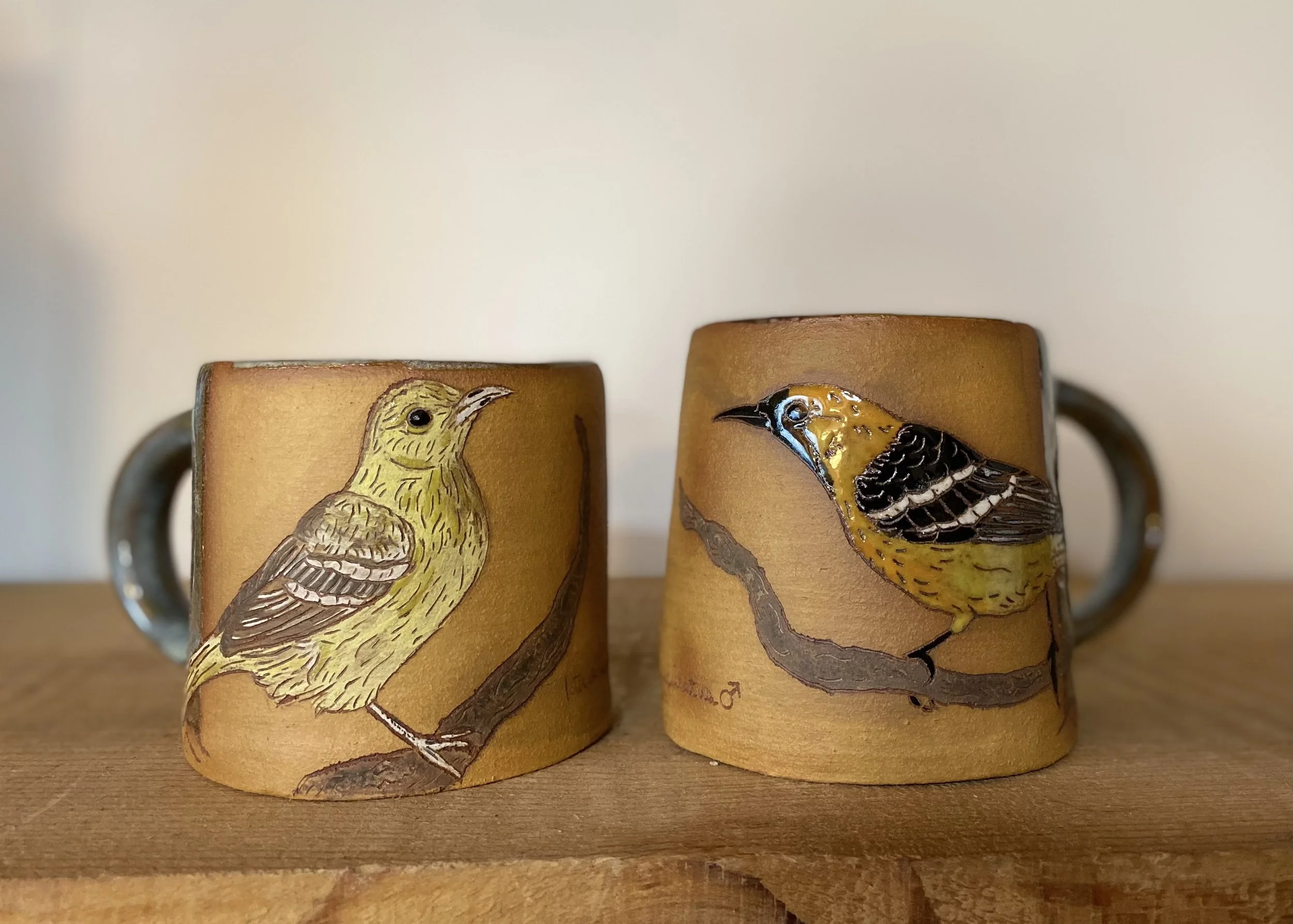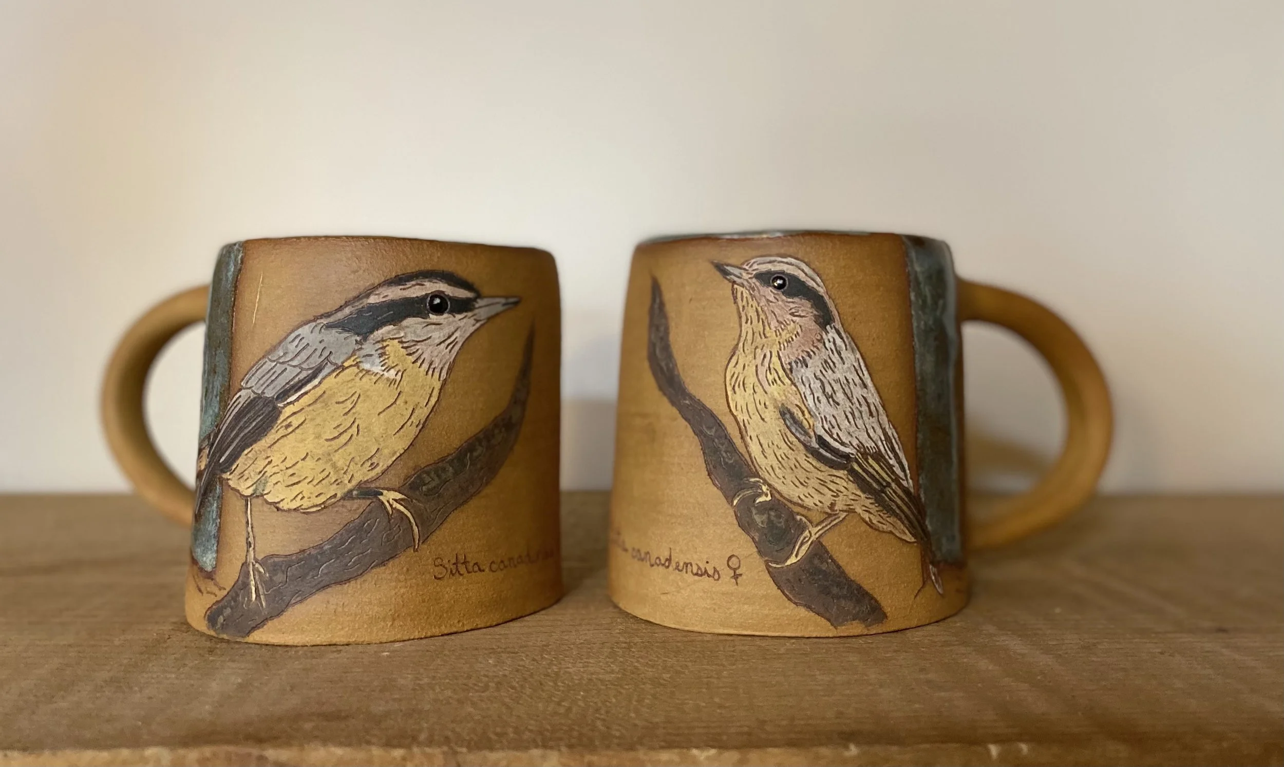 a series of mugs based on a study revealing that ignoring female birds leads to inadequate habitat protections (Bennet et al., 2019: Overlooked sexual segregation of habitats exposes female migratory landbirds to threats).